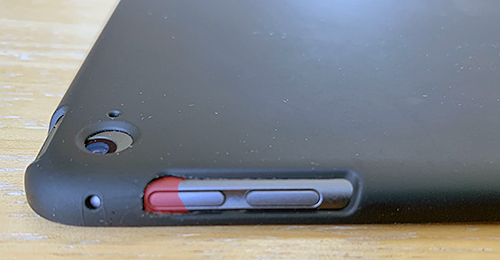 ボリュームボタンは位置が上に移動しました。これはもう自分で削るしかありません。下の写真で赤い部分(説明のために画像加工で赤を載せました)をヤスリで削りました。