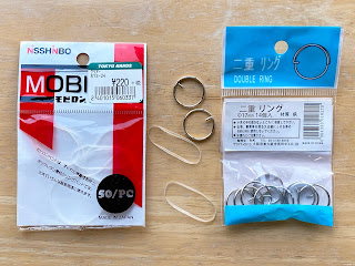 ちなみに、金属リングは主に百円ショップで買った「二重リング」を「オビロンバンド」で留めています。オビロンバンドとはポリウレタン製の輪ゴムで、天然ゴムのように劣化して切れたりネバネバになったりとかしないので、僕はいろんなところで使っています。東急ハンズで50本入り220円(税別/2020年8月現在)でした。