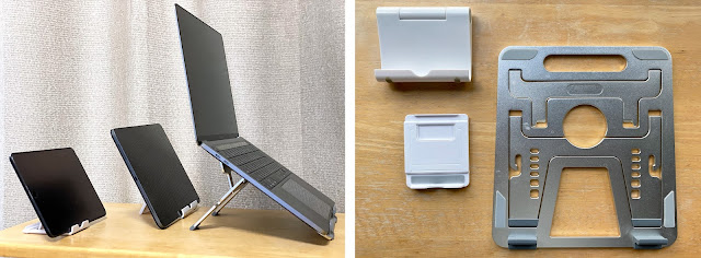 僕の使っているMacBook用「ノート パソコンスタンド pcスタンド 折りたたみ」と、一番小さな「超軽便・折り畳み式 スマホ・ タブレット用スタンド」は折りたたむと、1枚の板のようになり、とてもコンパクトです。自宅用途ではあるのですが、このようなシンプルでかさばらないものが僕の場合は精神衛生的にも助かります。